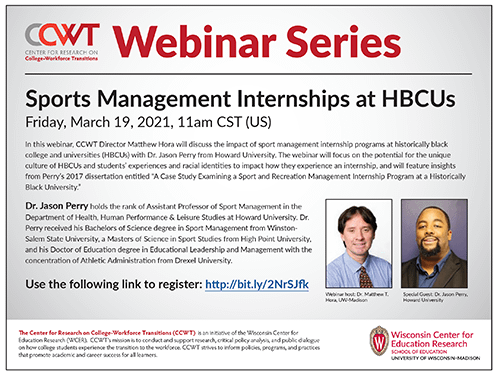 In this webinar, CCWT Director Matthew Hora discussed the impact of sport management internship programs at historically black college and universities (HBCUs) with Dr. Jason Perry from Howard University.
