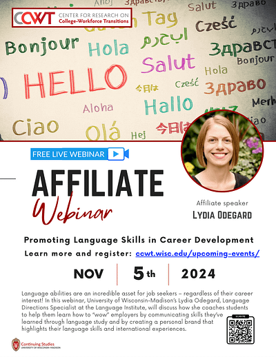 In this webinar, University of Wisconsin-Madison’s Lydia Odegard, Language Directions Specialist at the Language Institute, will discuss how she coaches students to help them learn how to “wow” employers by communicating skills they’ve learned through language study and by creating a personal brand that highlights their language skills and international experiences.